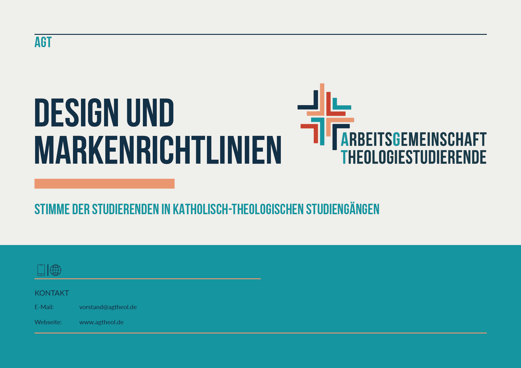 Die im Style Guide aufgeführten Richtlinien beschreiben die visuellen und schriftlichen Elemente, die die Corporate Identity der Arbeitsgemeinschaft Theologiestudierende für die kommenden Jahre definiert und festlegt. Die Richtlinien beinhalten den Namen, das Logo und weitere Elemente wie das zukünftige Farbprisma, Grafiken und Typografien.
