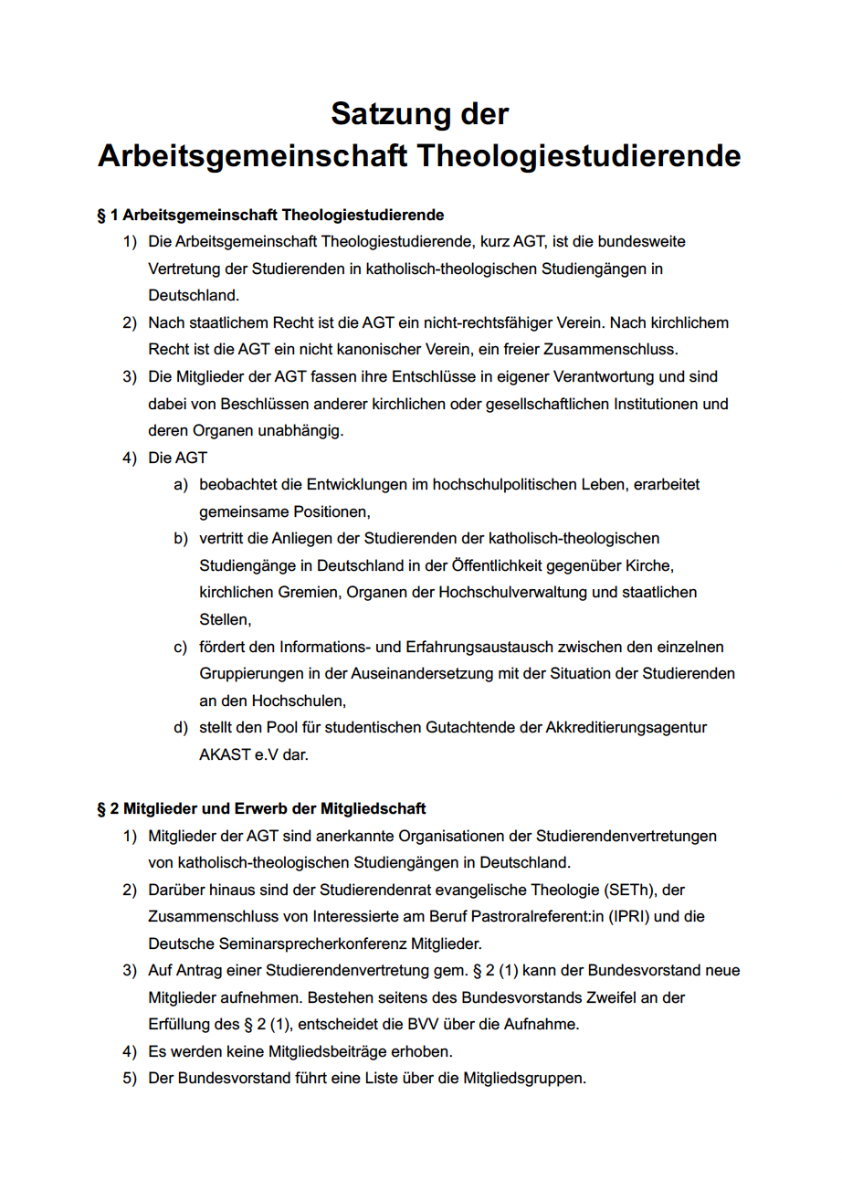 Die AGT versammelt studentische Interessenvertretungen aus katholisch-theologischen Studiengängen in Deutschland und stellt das studentische Sprachrohr gegenüber Hochschulen, Kirche und Gesellschaft dar.
